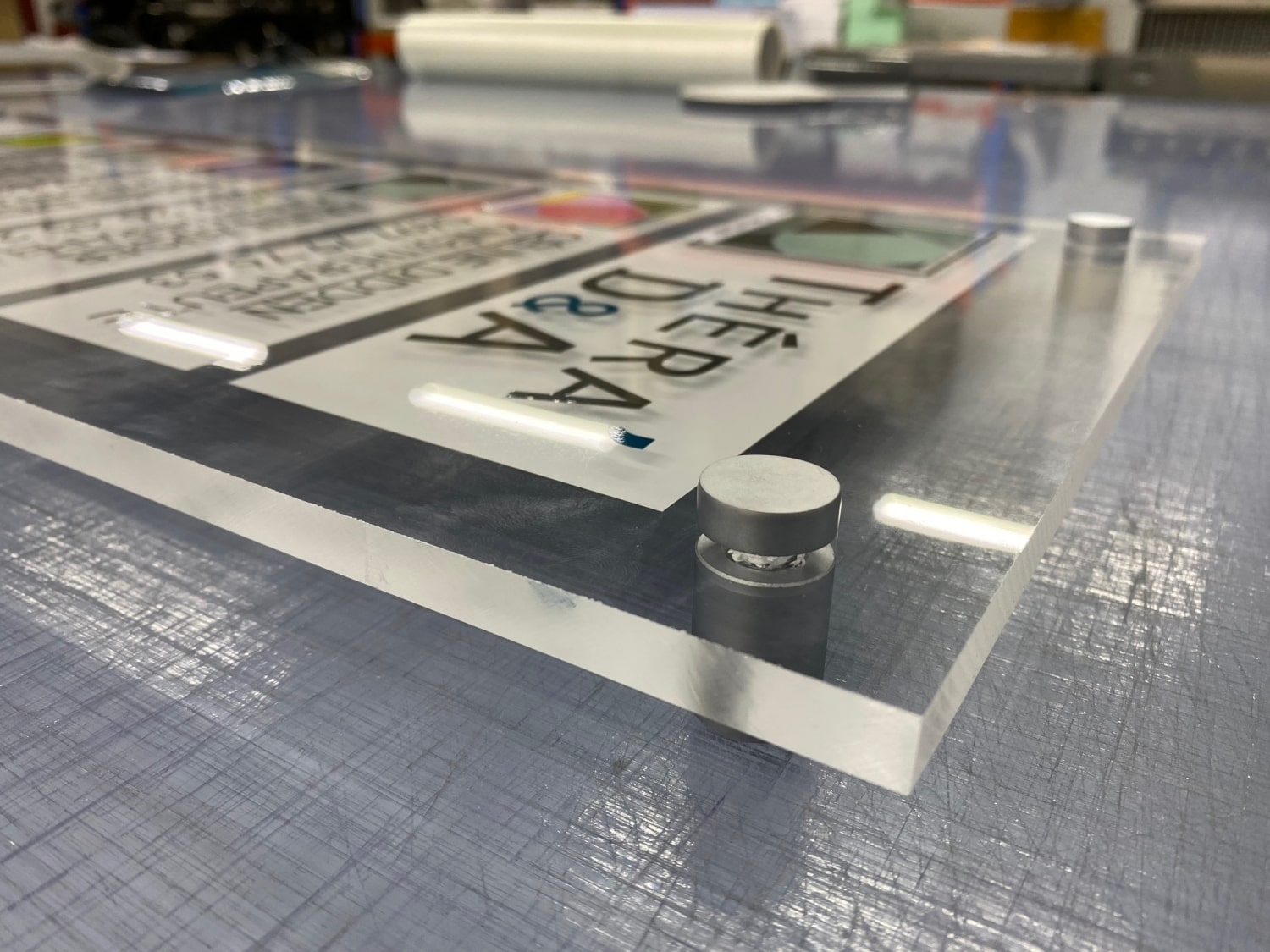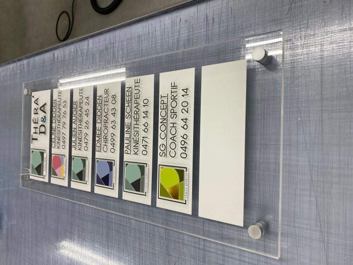 info@lprint.be TEL : 087/78.69.69Réalisation d'un panneau en plexi 10 mm avec attaches spécifiques aux 4 coins,
